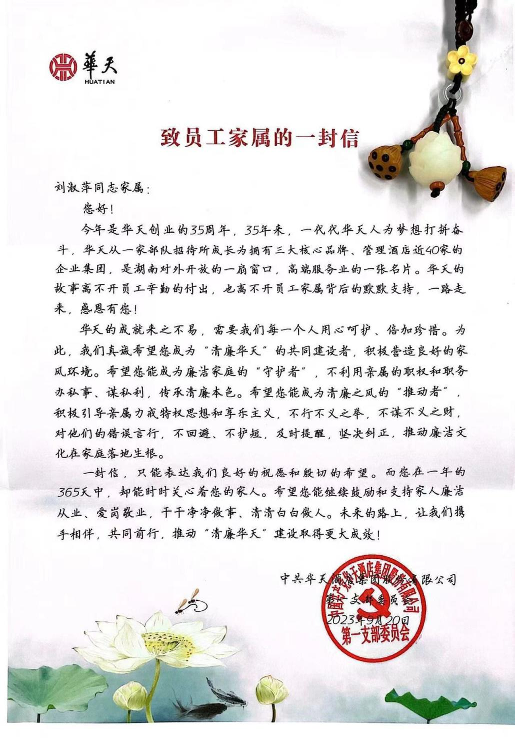 日前,一封来自华天酒店集团党委的清廉家书《致员工家属的一封信》寄到了党员干部家属的手中,拉开了华天酒店党委“党风廉政教育周”活动的序幕。