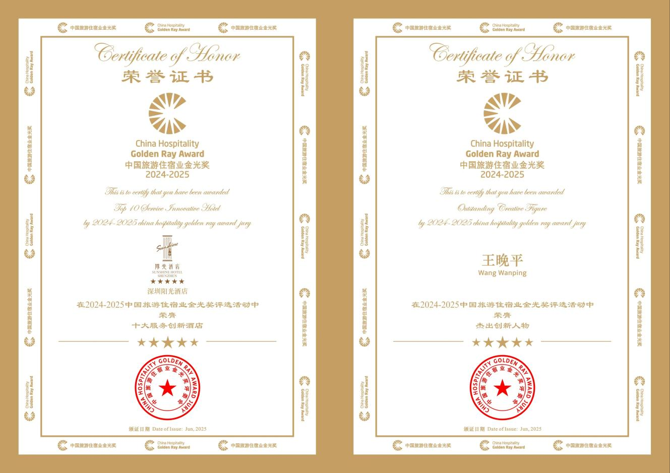 深圳阳光酒店荣膺金光奖双项殊荣