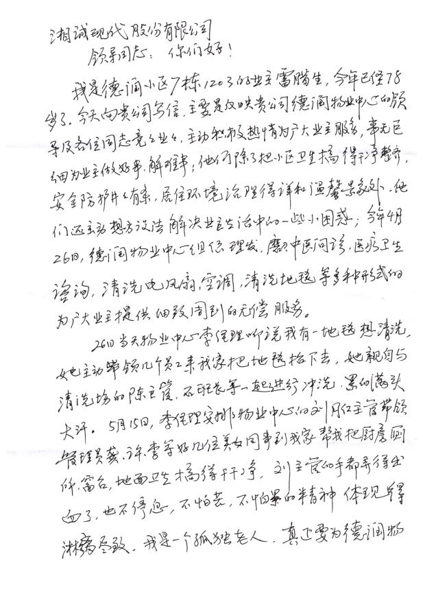 5月22日,湘诚现代湖南分公司收到了一封来自德润小区业主雷大爷真情满满的手写感谢信。